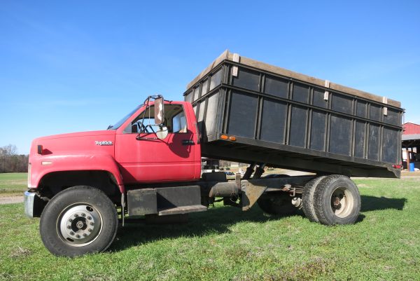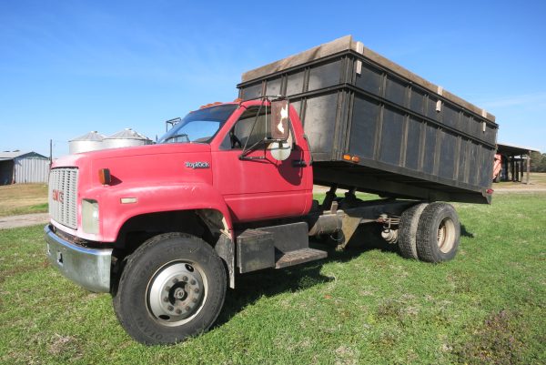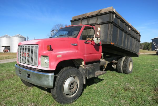 1990 GMC TOPKICK, 5 SPD WITH 2 SPD, AIR BRAKES, SELLS WITH 14′ TWIN CYL DUMP, 207K MILES
